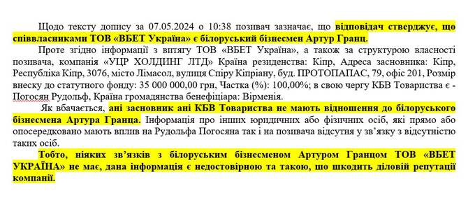 Цитую: «ніяких зв’язків з білоруським бізнесменом Артуром Гранцом ТОВ «ВБЕТ УКРАЇНА» не має, дана інформація є недостовірною та такою, шо шкодить діловій репутації компанії.»